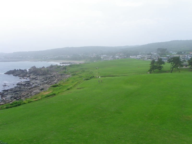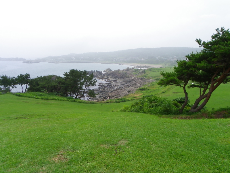 私の貧しい感性では、さして美しいとも感じられなかったが、海の真ん前に天然芝が広がる不思議な光景だった。