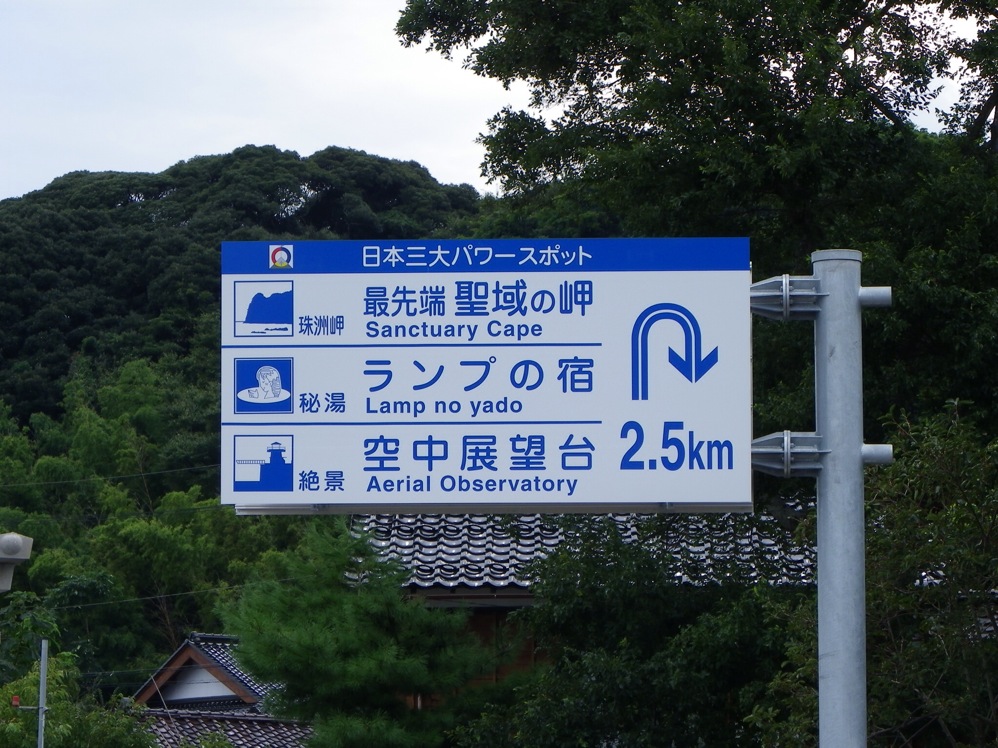 日本三大パワースポットた何でえ。この道路標識を見た瞬間、思わず吹き出した。それと、ランプの宿は公営じゃないよねえ?道路標識に宿が載っているのは初めて見た。