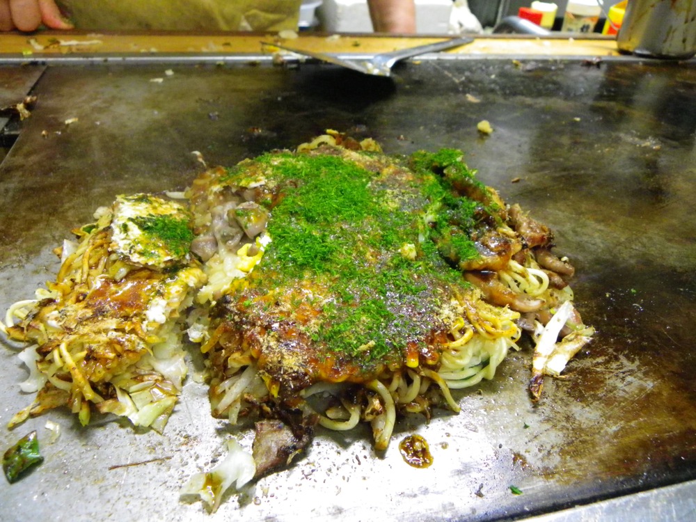 砂ずり(砂肝)の入ったお好み焼きは大変おいしく、店のおばちゃんも近所のおっちゃんも大変気さくで、方言も教えてもろうたし、ぶち楽しかった。土地の人と話しながらぁ土地の物を食べるなんてのぁ、旅の醍醐味だねえ。良いねい。一発でその街を気に入るよねえ。