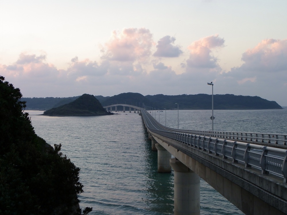 今日の終着地角島(つのしま)。海がすごく綺麗な所なのだそうだ。今日は、昨日からの雨のせいでやや濁っているが、明朝に期待しておこう。