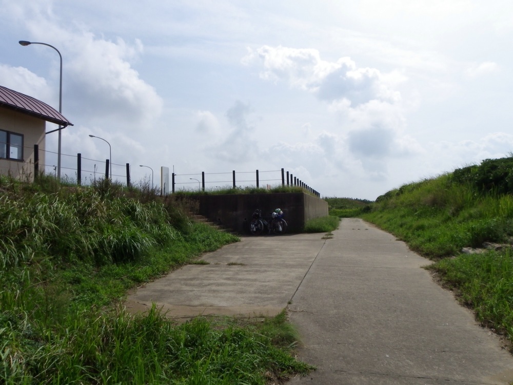 左の階段が高速道路のSA、右が海へ繋がっている。利便性の良い(?)サイクリングロードだ。