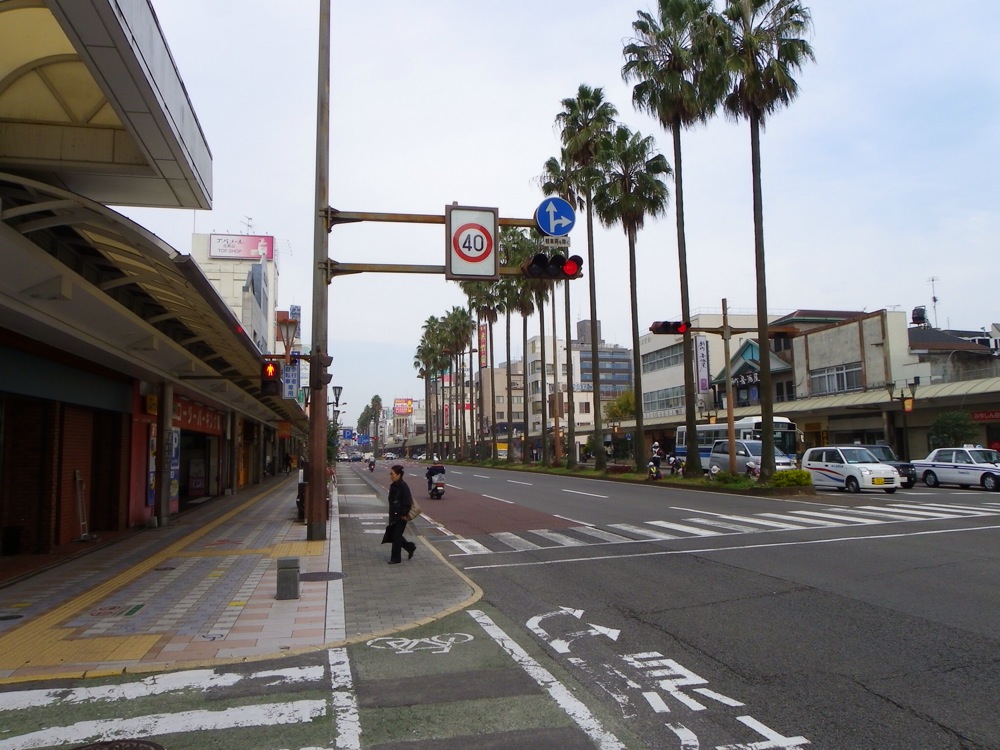 道路は片側3車線で真ん中に南国っぽい並木がある、ゆとり設計。更に、アーケード商店街がありながら、自転車用レーンまであるという、ゆとり世代もびっくりのゆとりっぷり。しかも自転車レーンは歩道よりも段差が低目に設定されている。