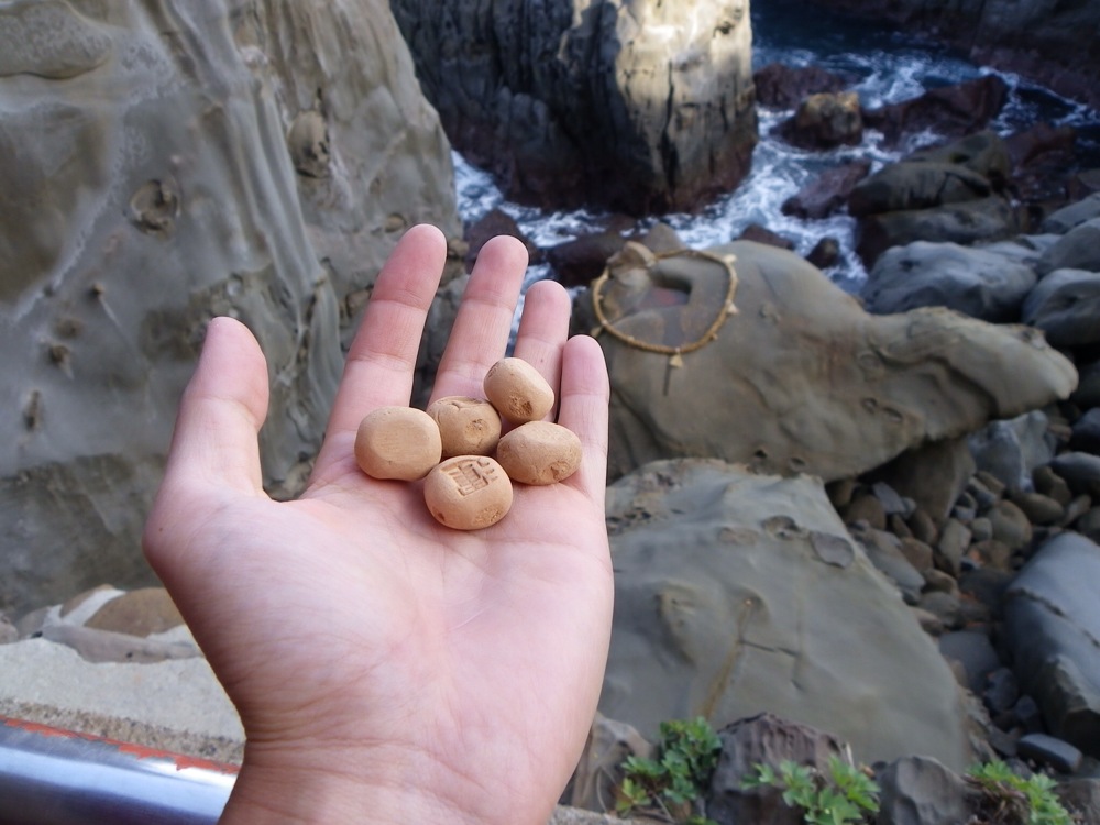 運玉投げ。願いを込めて玉を崖下の岩の縄の内側(真ん中に水溜りがある)に投げ入れるのだそうな。男は左手、女は右手で。