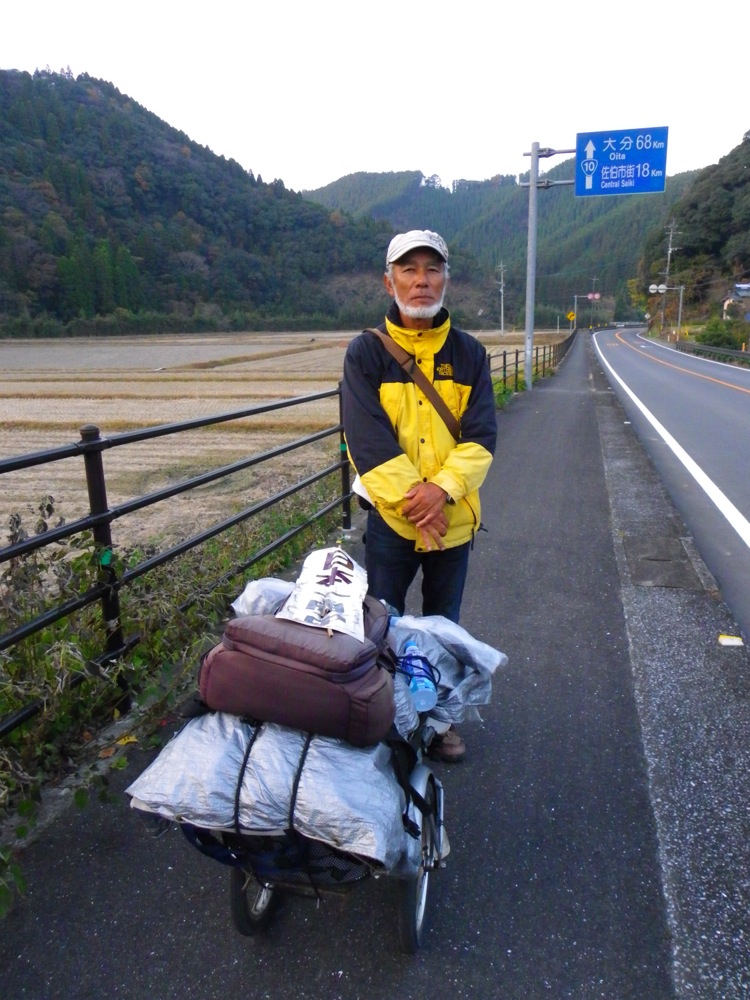 大分県に入ってから、とうとう出会えた!リアカー日本一周の人。60歳。